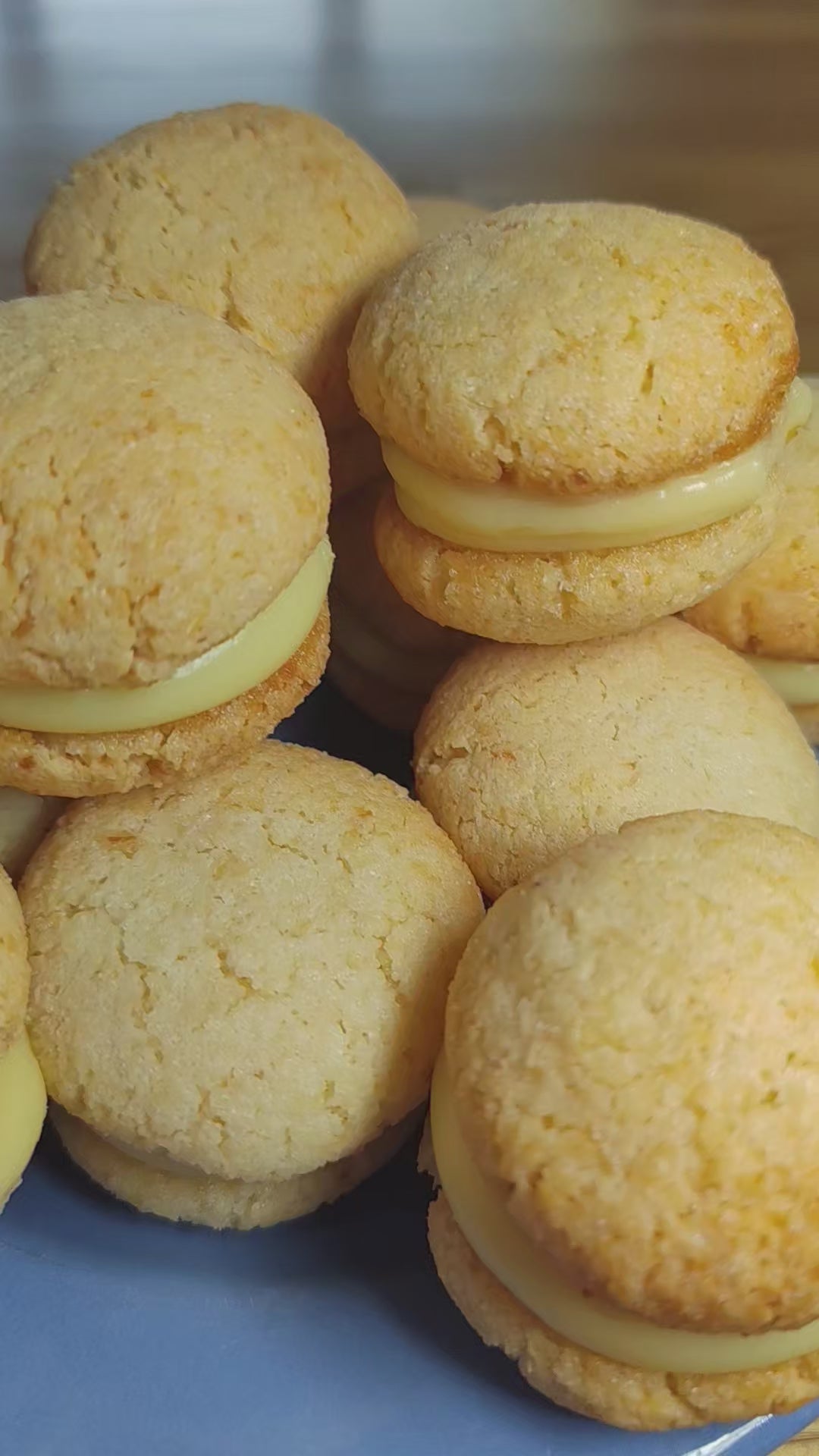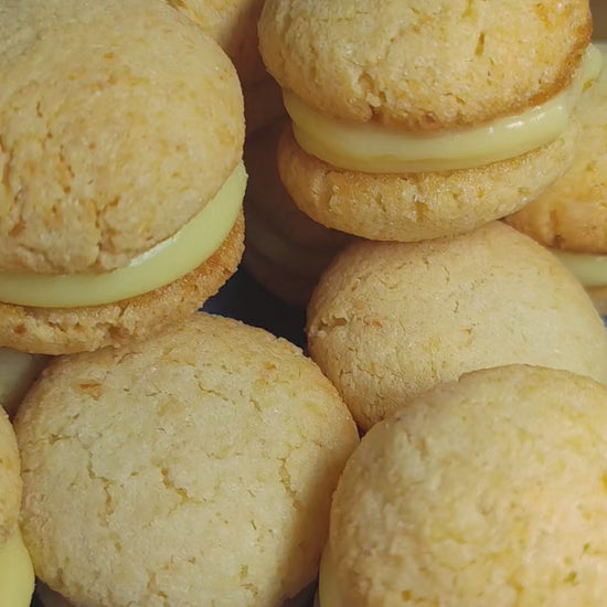 Our ergolavos sweets are made from finely ground almonds and baked into soft, chewy cookies that are gently paired together with a layer of silky vanilla crème pâtissière.