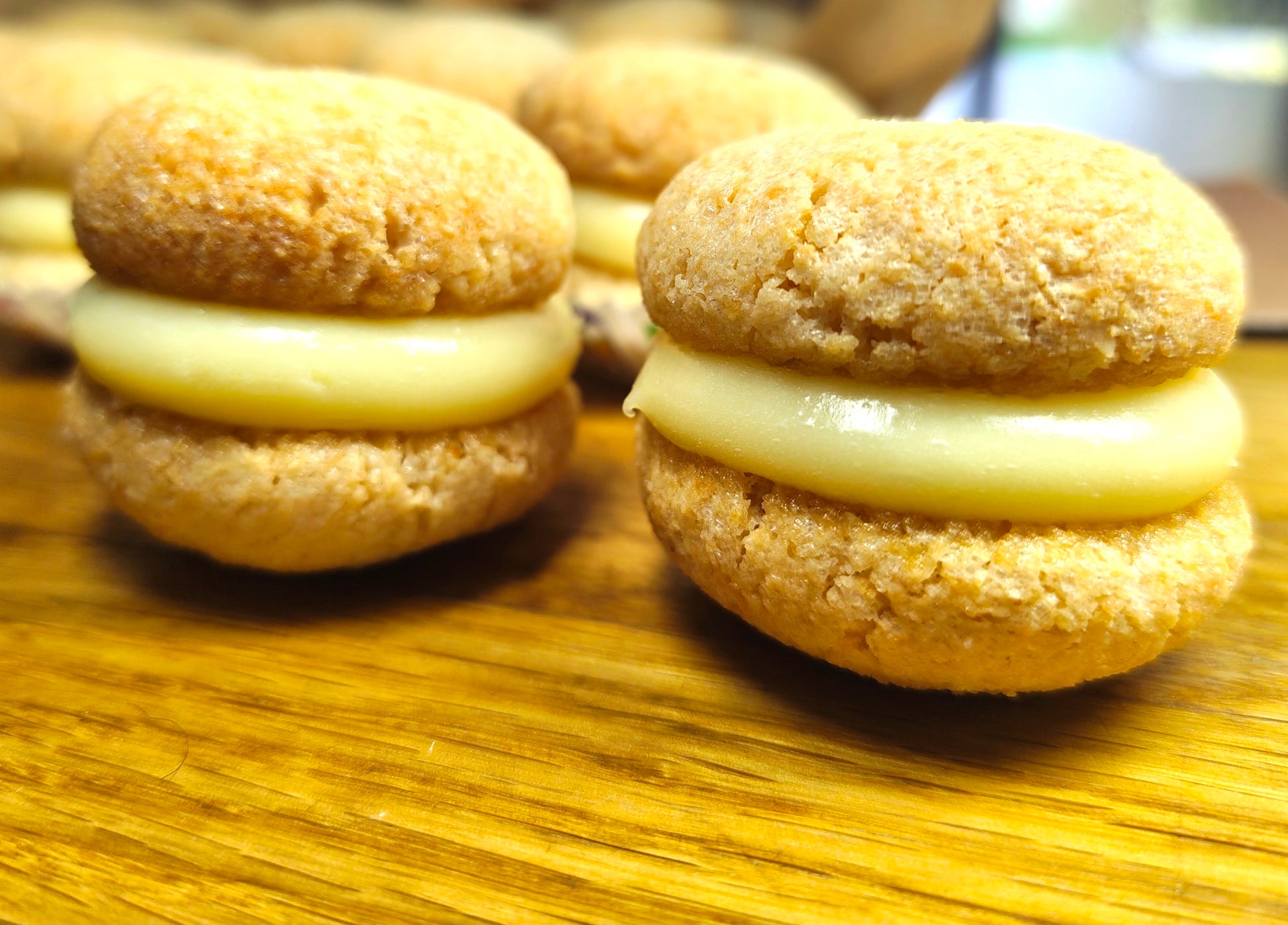 The cookie's texture is subtly reminiscent of a macaron — with a tender, chewy almond centre — but with a more rustic, naturally nutty flavour that comes from ground almonds. The smooth pastry cream filling adds a luxurious, velvety contrast, creating a beautifully balanced bite that is both light and indulgent.
